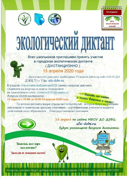 В рамках республиканской дистанционной недели экологической грамотности 15 апреля 2020 года в онлайн-формате прошел экологический диктант в объединении дополнительного образования детей “Вокруг света” МБОУ ДОД ДДТ с.Стерлибашево в МБОУ СОШ с. Кабакуш.