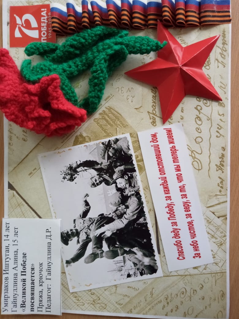 В рамках мероприятий, посвященных 75-летию Победы в Великой Отечественной войне 1941-1945 годов, с целью сохранения и увековечения памяти о проявленном в годы Великой Отечественной войны героизме советских солдат и тружеников тыла, в условиях пандемии ДДТ с. Стерлибашево провел онлайн конкурс «Поклонимся великим тем годам…» среди своих обучающихся.