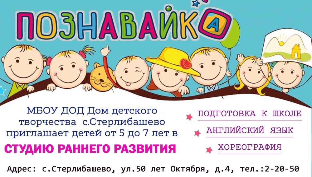 По многочисленным просьбам родителей объявлен дополнительный набор детей от 5 до 7 лет в СТУДИЮ РАННЕГО РАЗВИТИЯ "ПОЗНАВАЙ-КА". Предварительная запись производится по адресу: с.Стерлибашево, ул. 50 лет Октября, д.4, кабинет №8. Справки по тел.: 2-20-50