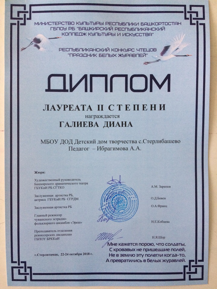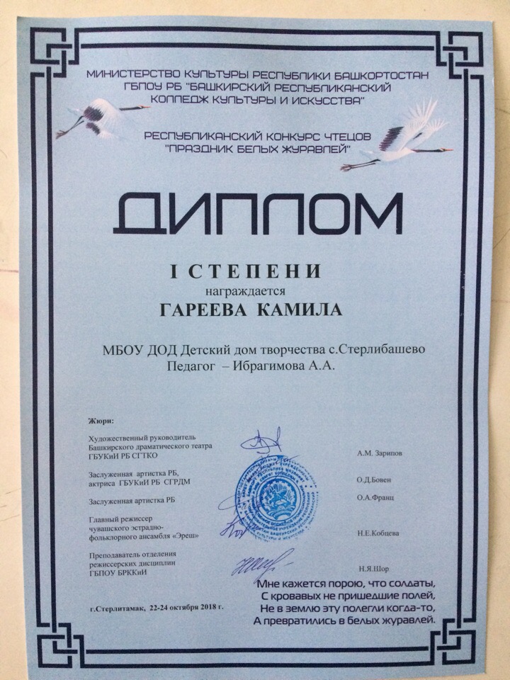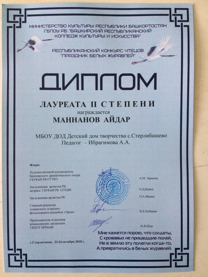22-24 октября 2018г. в городе Стерлитамак прошёл Республиканский конкурс чтецов «Праздник белых журавлей» в рамках дня поэзии и памяти, павших на полях сражений во всех войнах. Организаторами конкурса являются Государственное бюджетное профессиональное учреждение РБ Башкирский республиканский колледж культуры и искусства. В конкурсе приняли участие более 470 участников из крупных городов и районов Республики.