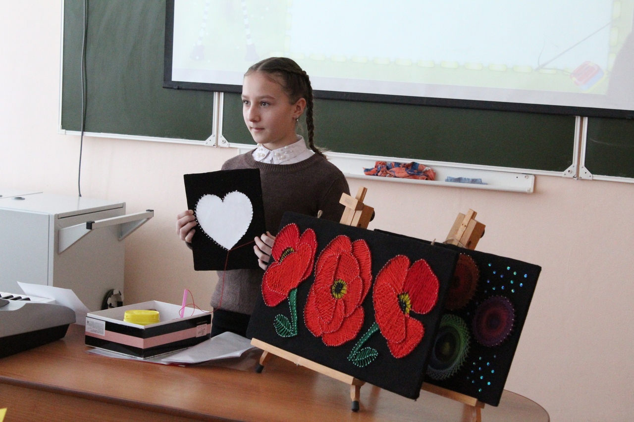 Затем была организована работа секций по направлениям. Айгиза представила свою исследовательскую работу «Ниткография на гвоздях – Стринг Арт» в секции технологии. В ней быдо заявленно 18 участников. По итогам работы конференции она заняла 2 место. Молодец! Так держать!