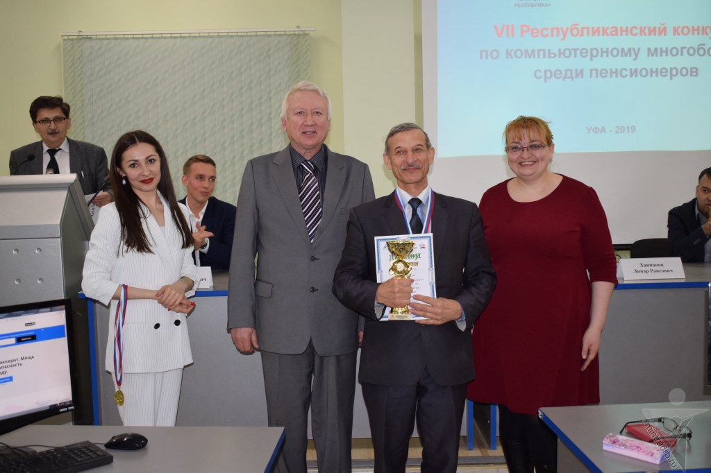 В Уфе 16 апреля определились победители VII Республиканского чемпионата по компьютерному многоборью среди слушателей программы «Народный университет третьего возраста». Четвертый год подряд чемпионат проходит на площадке Башкирского государственного педагогического университета имени М.Акмуллы. Организаторами мероприятия выступили Министерство семьи, труда и социальной защиты населения Республики Башкортостан и региональное отделение Союза пенсионеров России при поддержке регионального отделения партии «Единая Россия», регионального отделения Пенсионного фонда Российской Федерации по Республике Башкортостан и Госкомитета РБ по информатизации и вопросам функционирования системы «Открытая Республика». За звание самого продвинутого пользователя состязались 25 участников старше 55 лет. В течение двух часов они выполняли задания на знание назначения портала Пенсионного фонда Российской Федерации, поисковой системы Яндекс и задания по безопасности в Интернете. В итоге наивысшую скорость и точность ответов продемонстрировали на состязаниях Елена Яшина из Давлекановского района и Анатолий Квасов из Федоровского района. Второе место заняли Ризеля Биктимирова из Куюргазинского района и наш педагог Вячеслав Ниязгулов Адибович из Стерлибашевского района. Третье почетное место завоевали Тамара Сулейманова из Уфимского района и Яков Нечаев из Калтасинского района. Победителям чемпионата были вручены кубки, дипломы и медали. Участие в награждении приняла Советник руководителя регионального исполкома «Единой России» Гульнара Хамиева .
