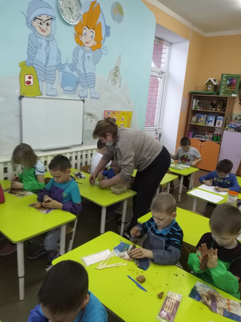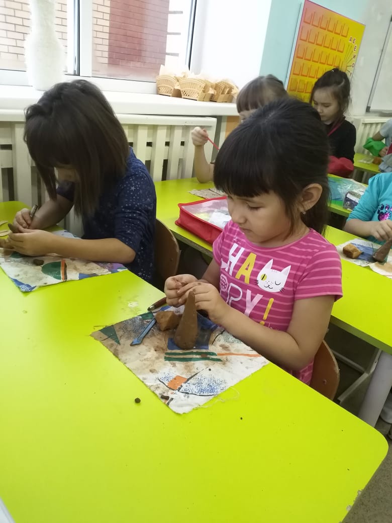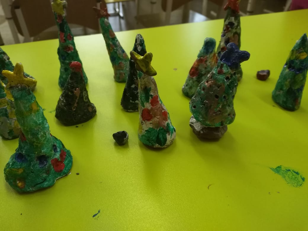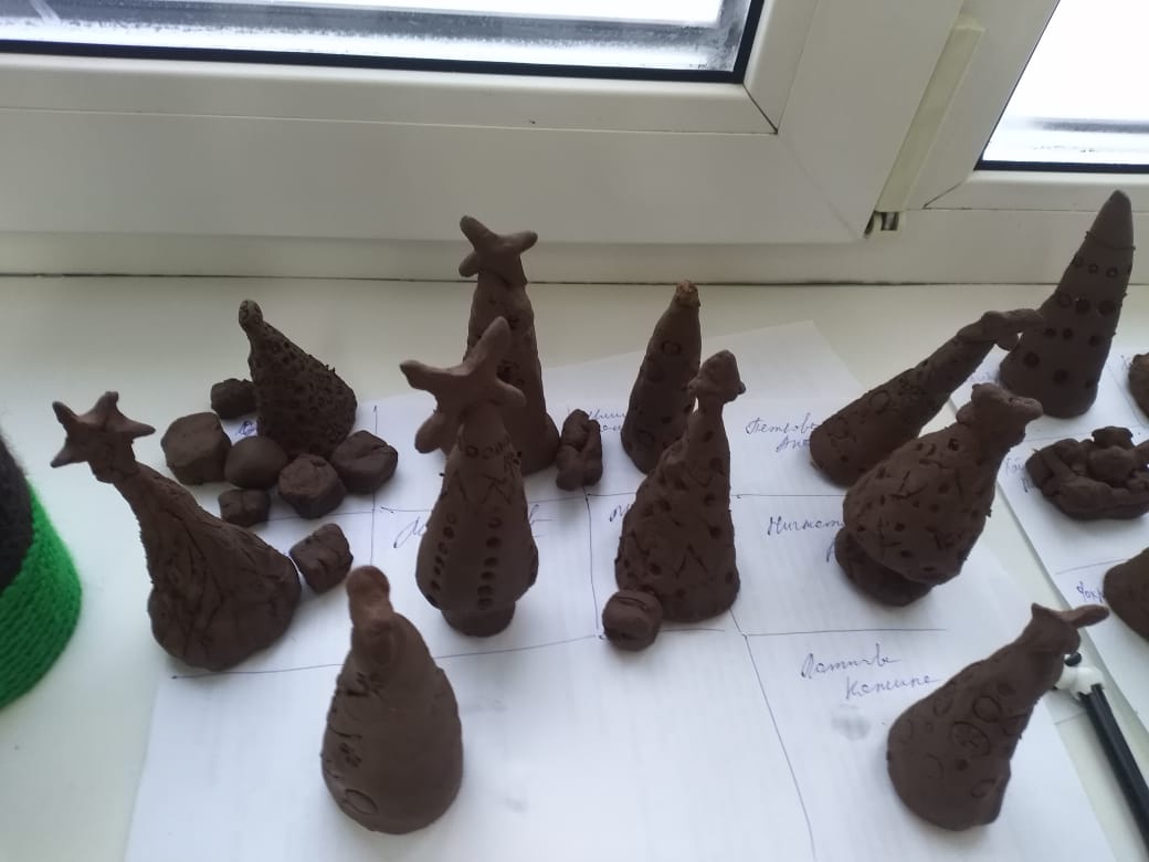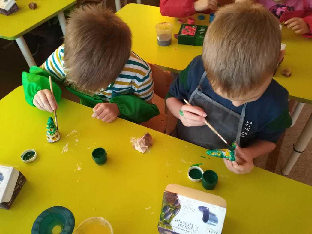 В детском саду в объединении "Лепка и керамика" в воспитанниками подготовительной и старшей группы начали готовить новогодние поделки. На занятии дети с радостью лепили объёмную елочку в форме конуса , для украшения использовали печатки, дети сами придумывали интересные идеи для украшения. Самое приятное для детей это раскрашивание готовых изделий. Дети включили свою фантазию и каждый ребенок раскрашивал свое изделие творчески, используя яркие цвета. С детьми устроили хоровод разноцветных, новогодних елочек! Молодцы, ребята!