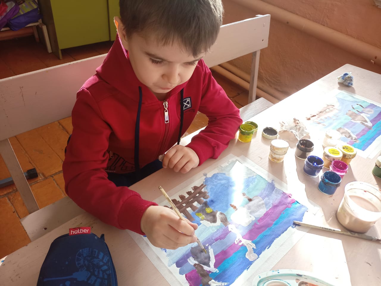 В начале занятия ребята вспомнили, что такое жанр «пейзаж», повторили основные правила работы гуашевыми красками. Педагог поэтапно показала все этапы работы над пейзажем, остальные дружно повторяли. Во время мастер класса царила особая творческая атмосфера. Ребята вместе с родителями создали красивые работы и остались очень довольными!
