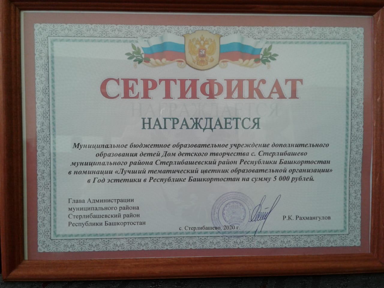 По итогам работы за 2019-2020 учебный год наше учреждение в номинации «Лучший тематический цветник образовательной организации в Год эстетики в Республике Башкортостан» было награждено денежным сертификатом.